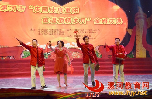 典礼现场 市领导王惠(中)、陈平(右2)、栗社臣(左2)、胡新峰(右1)出席庆典 开场舞《花开盛典》 少儿舞蹈《雁南飞》 三句半《为金婚喝彩》 获奖老人走过红地毯合影留念